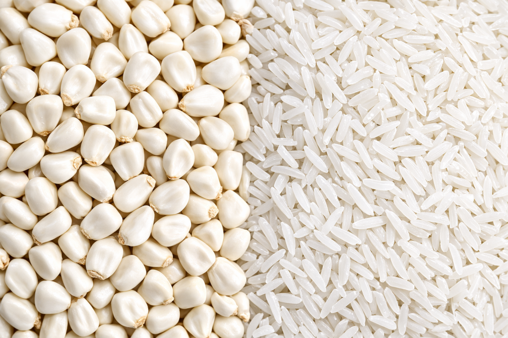 White Maize (Non-GMO), Rice, and Millet — cleaned, graded, and prepared for export markets.