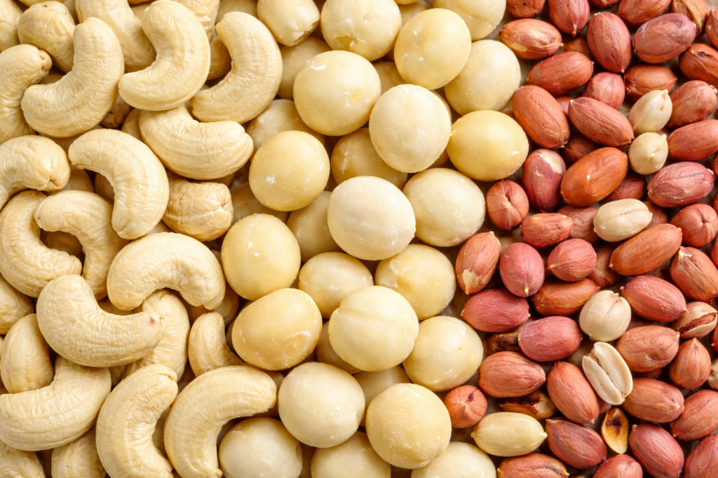 Cashew nuts, macadamia nuts, and peanuts (groundnuts), carefully selected for quality and freshness.
