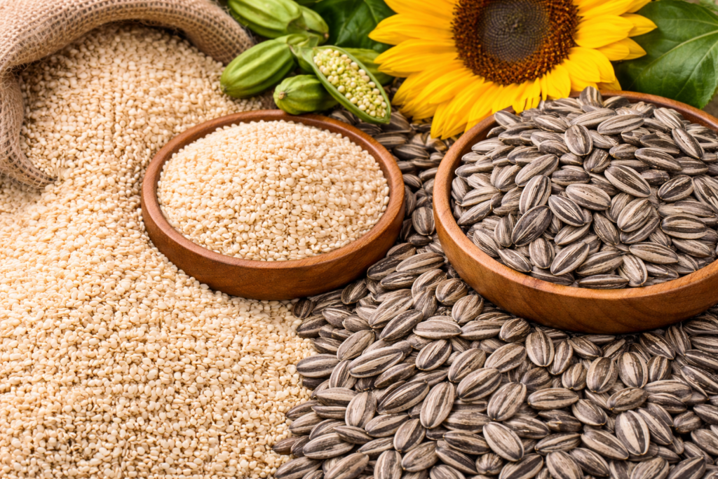 Sesame seeds and sunflower seeds, ideal for food processing and oil production industries.