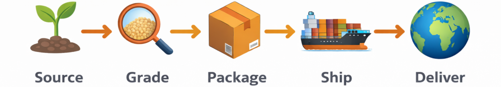 From sorting and grading to export documentation and compliance checks, we ensure every shipment meets international standards before it leaves origin.